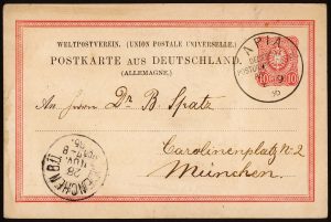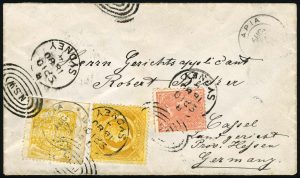 There are no covers recorded addressed to Germany from the pre-post office period up to 1877 but with the opening of the Samoa Express post office in 1877 the majority of all covers recorded are mailed to Germany or to German interests in other areas.